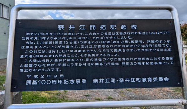 明治22年秋から23年春にかけて、この地方の植民地区画が行われ明治23年8月7日当時の滝川村から奈井江村(砂川・奈井江・上砂川)が分村しました。 当時上川道路(国道12号線)の開通により駅逓(現在の駅、郵便局、旅館のような仕事のするところ)が設置され、奈井江が認可されたのは明治22年3月16日です。 この地には8月15日に第4美英舎という名称で開業されましたが明治24年北海道鉄道(函館本線)の開通により、その後廃止されました。 この碑は当時大森林に桑を入れ、町の基礎つくりに苦労された開拓者対する感謝と慰霊の心を捧げ、昭和49年9月町の開基85周年、開町30周年記念事業として建立したものです。
